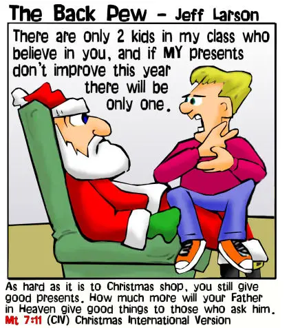 This Christmas cartoon features a doubting child sitting on Santa's lap