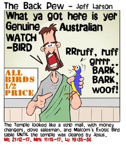 This gospel cartoon features a guy selling birds in the temple just before Jesus turned the tables