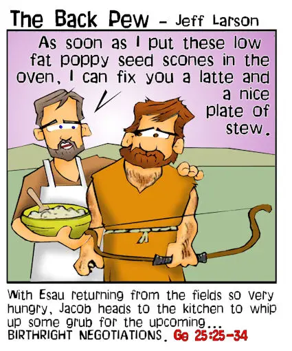 This bible cartoon retells the birth right negotiations between brothers Jacob and Esau