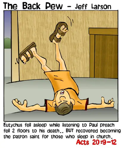This bible cartoon retells when Eutychus fell asleep while Paul preached and fell to his death, but was revived