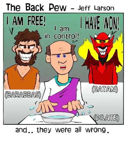 This Easter cartoon feature Pilate, Barabbas, and Satan who believed they won