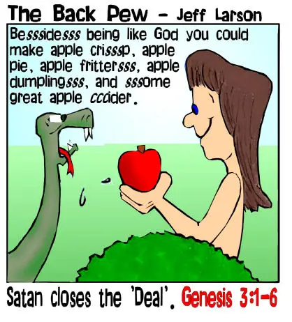 This bible cartoon from the book of Genesis remembers when the snake aka Satan tempts Eve