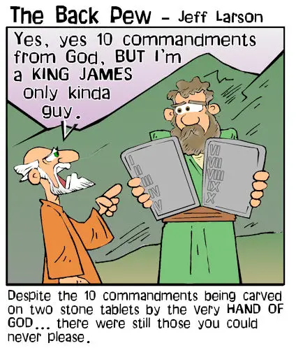 This bible cartoon features Moses and the Ten Commandments not being in King James