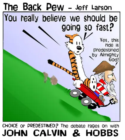This christian cartoon ponders a wagon ride with John Calvin and Hobbes